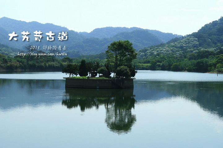 遠眺頭寮大池,可惜被花團簇擁的油桐花給擋住了,無法顯現頭寮大池的魅力,只好拿出四年前在觀景台拍的照片,地點選得真是有夠好,頭寮大池的美景一覽無遺,崁津三橋依稀可見,如果想要到大芎艽古道一訪的遊客,什麼地方都可以錯過,就是不要錯過觀景台,往溪洲山的路上走去一下就到囉 XD