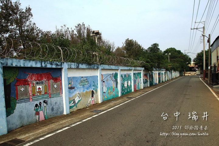 大肚火車站前方就有公車站牌,真好 !! 搭乘藍11到井子頭下車,這時看到路旁有瑞井古井的指標,於是便走進遊園路一段69巷,再右轉來到瑞井路,就會看到這一整片的彩繪牆面伴我行,似乎年代久遠,上邊滿是歲月的滄桑,不過連瑞安宮的大名都能見到,那麼至少應該沒有走錯路啦 XD