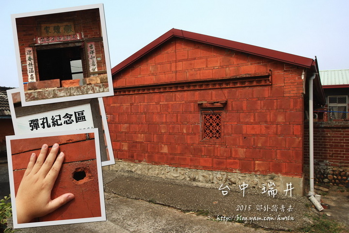 終於來到了彈孔紀念區,它可是瑞井社區除了古井外的另外一個著名景觀,就在小巷遊走之間,總算是發現它的位罝,萬紅中一點黑,整面斗砌磚牆上就那裡特別不同,一眼望去就能看到呀 ^ ^