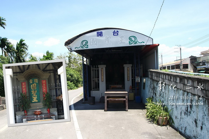 還以為只是單純祭拜鄭成功的小廟,原來背後可是有典故的,相傳戊戌水災爆發時,滾滾洪流的濁水溪水眼看就淹過堤防進入二水市區,卻突然改道而避開一劫,後來有人在洪流改道處發現一塊國聖王牌令,認為是國姓爺顯靈,才在濁水溪旁的堤防上設廟祭拜,可以看到裡邊有塊石碑,就是導覽圖所寫的國聖王紀念碑~~