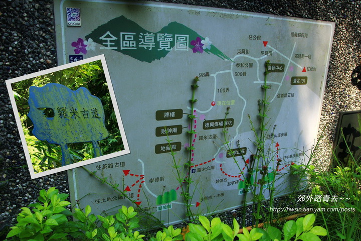 巷底有塊導覽地圖,都快被雜草淹沒了,不過還是可以看出路線輪廓,今次預定要拜訪的糶米古道長度相當短,不到500公尺,若是意猶未盡還可順便連走附近的一些景點,其中以途經挹翠山莊,通往四獸山的山徑最受歡迎~~