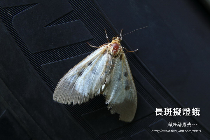 遇到一隻長斑擬燈蛾,外型看以久歷滄桑,要不是翅上斑點隱約可見,不然還真是快要認不出來 +_+