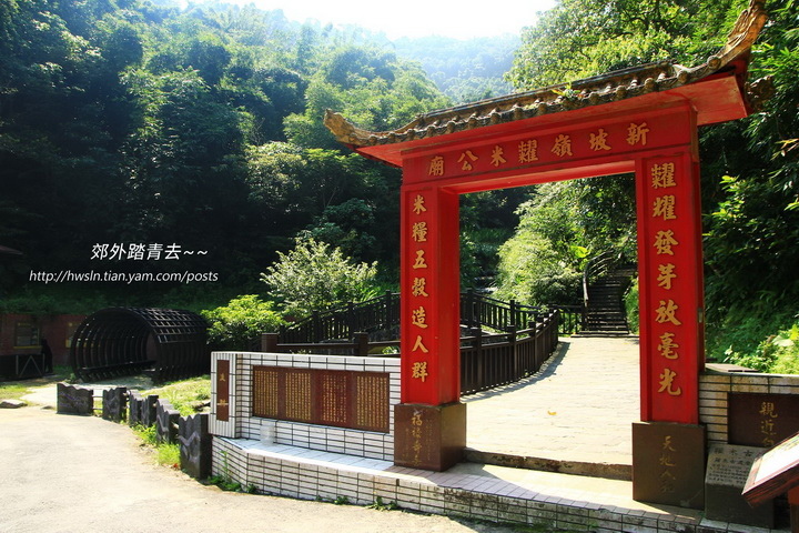 糶米古道入口就在德興煤礦旁,走進這座新坡嶺耀米公廟紅色牌坊,就是昔日先民要將收成的稻米運往深坑、石碇一帶販售,為了節省路程而另外闢建的越嶺捷徑,古道因而形成,直到日治初期都還是重要的農產運送道路~~