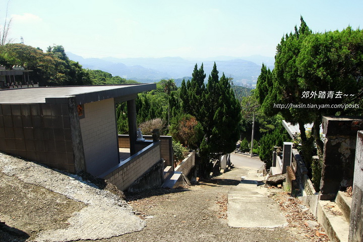 翻過山頭,週遭景觀為之一變,眼前就是著名的台北示範公墓,大概只有在清明時節才會人潮熙攘,現在就只剩絕對的冷清,下邊就是崇德街,可從深坑通往六張犁,少見人車,但是環境清幽、視野遼闊,要不是放眼望去盡是夜總會,不然也是不錯的郊外踏青路線~~