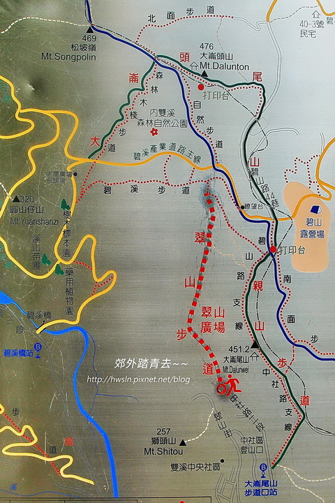 出發前先研究一下地圖,本來想說翠山步道走完就是無縫接軌自然步道再直奔大崙頭山,再從森林步道下山繞行碧溪步道回到起點,中途不慎誤入大崙尾山,還摸到了三角點 !! 搞不清楚的趴趴走,卻是今夏最棒的踏青回憶 ^_^