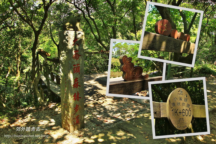 接下來前往大崙頭森林步道,入口處還設有名稱石碑,挺特別的,整修步道上有許多包含毛毛蟲、蝸牛在內的小昆蟲雕飾,看它所代表的意涵,說它是生態步道應該會更合適吧~~