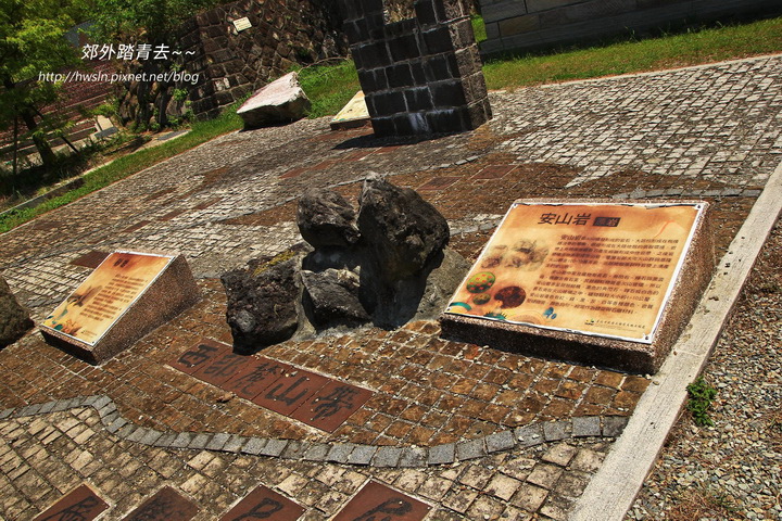 戶外也有關於當地岩石的介紹,並有實物可觀摩,像是安山岩不僅是大屯山區含量最多的岩石種類,亦是昔日台北城主要建材,它對台北而言,擁有地質與歷史意義,非常值得一看~~