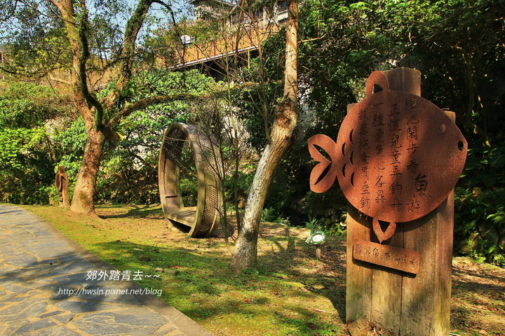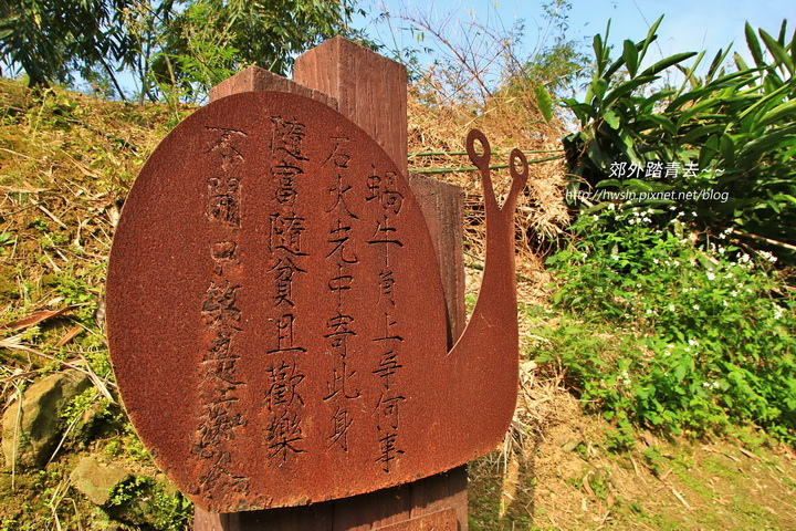 不愧是擁有文學步道名稱的山水秘境,隨處可見著名詩人的詩詞文句,其內容想必都是經過精心挑選,裡邊描述的景象或是象微都能與唐詩欣賞牌造形相呼應,像這首白居易的《對酒》,文內有提到蝸牛,所以立牌造形也是蝸牛,不禁會心一笑的莞爾,經過此處的人們想要視而不見都很難,比起一般隨便擺個幾首詩就了事的設計,算是很用心的設計 ^_^