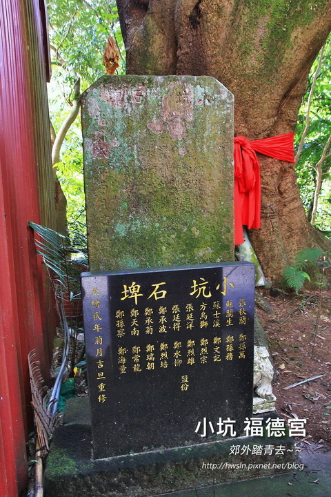 廟後方有棵老朴樹,據說已存在百年,與土地公廟相依共存,一旁有塊立於光緒二年(1876年)石碑,碑文已難以辨示,比較清楚的就是"小坑"、"石碑"幾字,看不清楚沒關係,前方還有仿製版可以詳閱,對照彼此文字,疑似還有部份缺漏,不過可以將幾乎風化殆盡的碑文復原到這個地步,已經算是很有誠意了~~