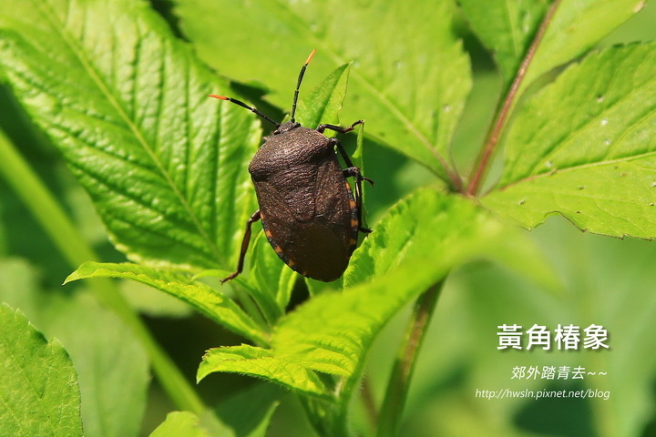 末點帶點黃的觸角相當好認,它就是黃角椿象,是今日見到的兩種椿象之一~~