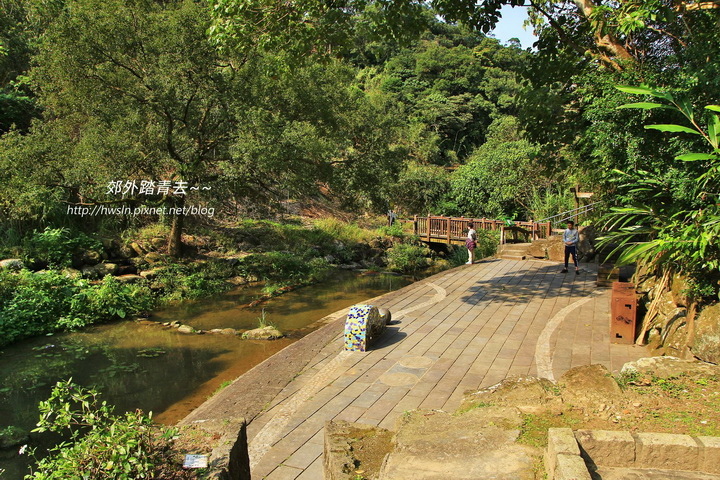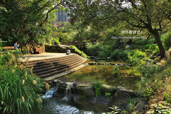 源自猴山岳的小坑溪,河道連綿數公里,下游大約在北政橋的位置匯入指南溪,這條奔流不已的山澗小河其中一小段被改造成適合閣家出遊的河畔幽境,細看河中紛亂石塊,其實都排列成迂迴彎曲的之字型水道,加上極其平緩的河流所營造的魚梯也替那些洄游性魚兒提供一條安全回家的路,一種利用類似阿里山鐵路的概念消弭上下游高低落差大的影響,相較其它地方,這裡對於魚兒們算得上是相當友善的環境~~