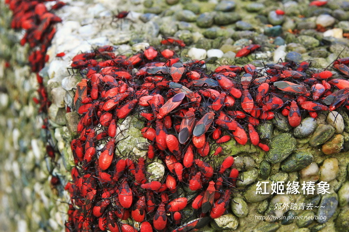 一開始只是覺得怎麼橋上石柱有些紅斑,細看下居然會動,紅紅的一大片好不嚇人,原來是紅姬緣椿象大爆發,剛剛才看到關於它的解說牌,沒想到主角這麼快就現身 !! 超有教育意義的~~這個季節特有的景觀,雖然模樣詭異但它們是無毒的,同樣是大自然的成員之一,默默路過就好.........