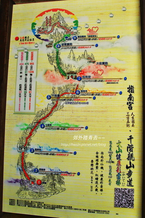 原來這條路線的名稱是指南宮千階親山步道,直到指南宮的紅色路段共有1346階,不負千階之名,後邊綠色加上粉紅色部份在圖中描繪的情形已是凌霄之姿,估計那裡應是猴山岳,消耗的卡路里卻僅有一百多大卡,看來要來回走好幾遍才會有瘦身效果 @_@