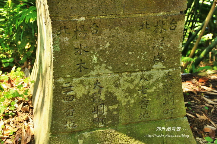走完第一段階梯就會見到立於兩側的石燈籠,保存相當完整,而且整條參道上不時可以見到它們的身影,數量之多完勝台灣現存的神社殘跡中那大多殘缺不全的石燈籠,在上邊都能見到文山郡、指南宮的字樣,走完一遭,會莫名其妙的對文山郡很有親切感 ^_^