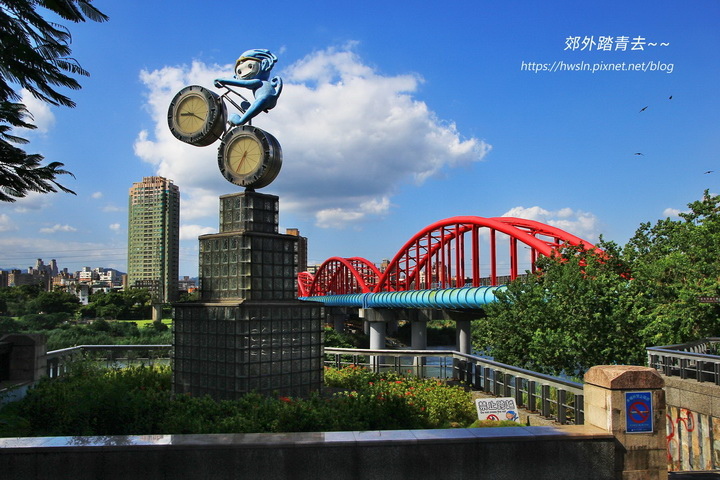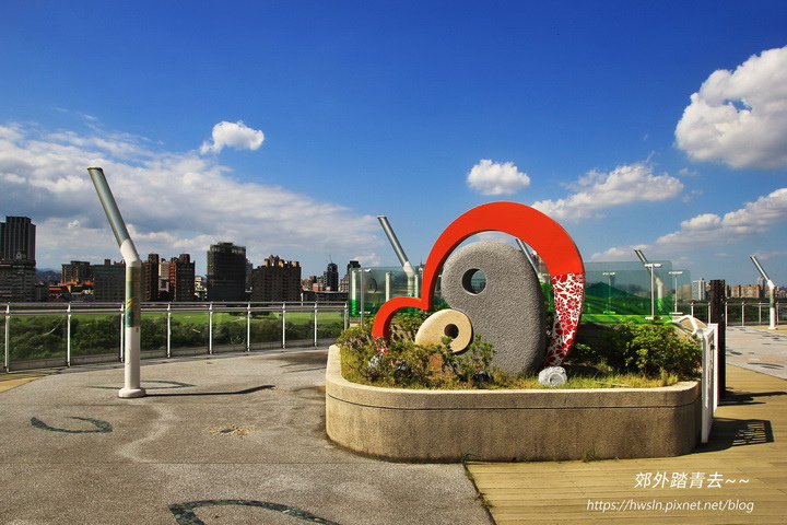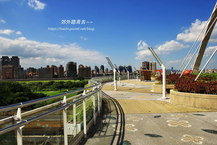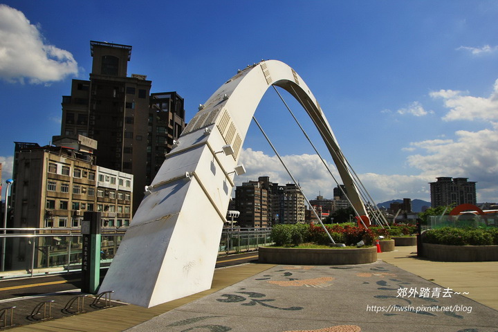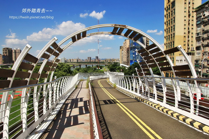將整座觀景平台撐起成為這一帶相當受到矚目的地標,這座白色鋼樑橋拱功不可沒,當初也是因為在遠處瞥見它才想要一探究竟,一旁即是自行車道,橫跨堤防連接台北市街與新店溪畔,就算上下坡陡度不小,可以悠閒地騎乘其中就是讚,這樣的設計理念完全不會輸給潭雅神自行車道上那為眾不少的特色景觀橋 !!